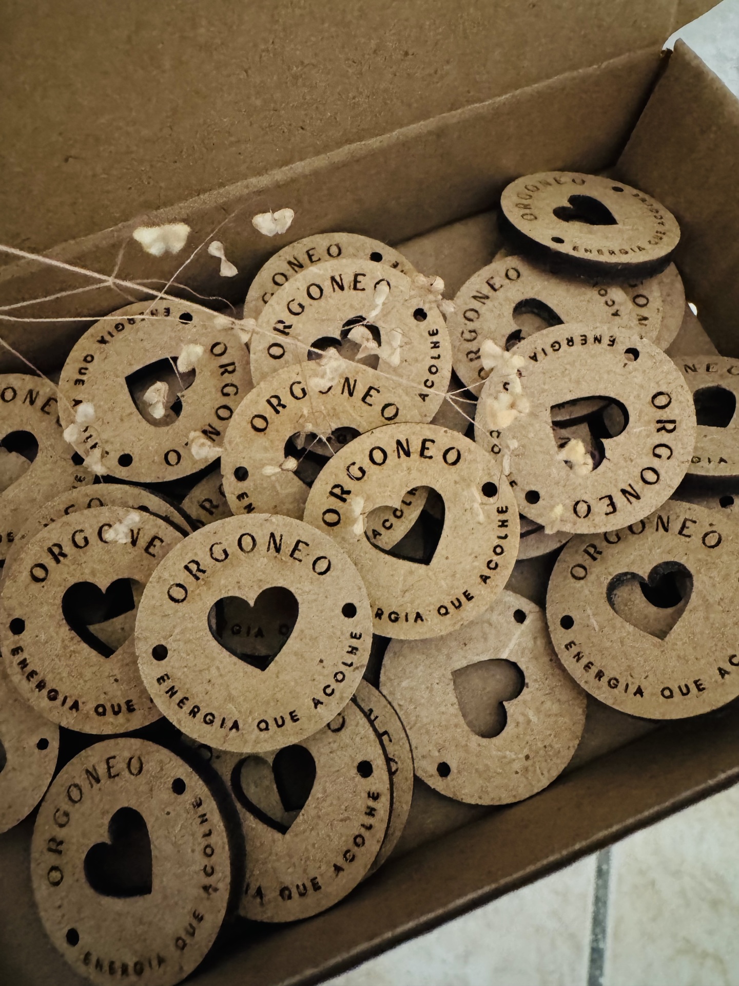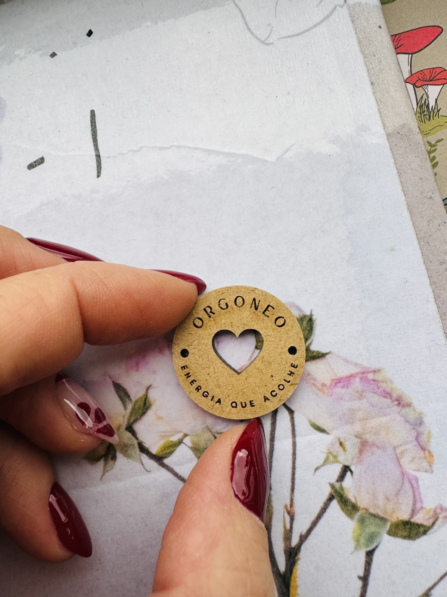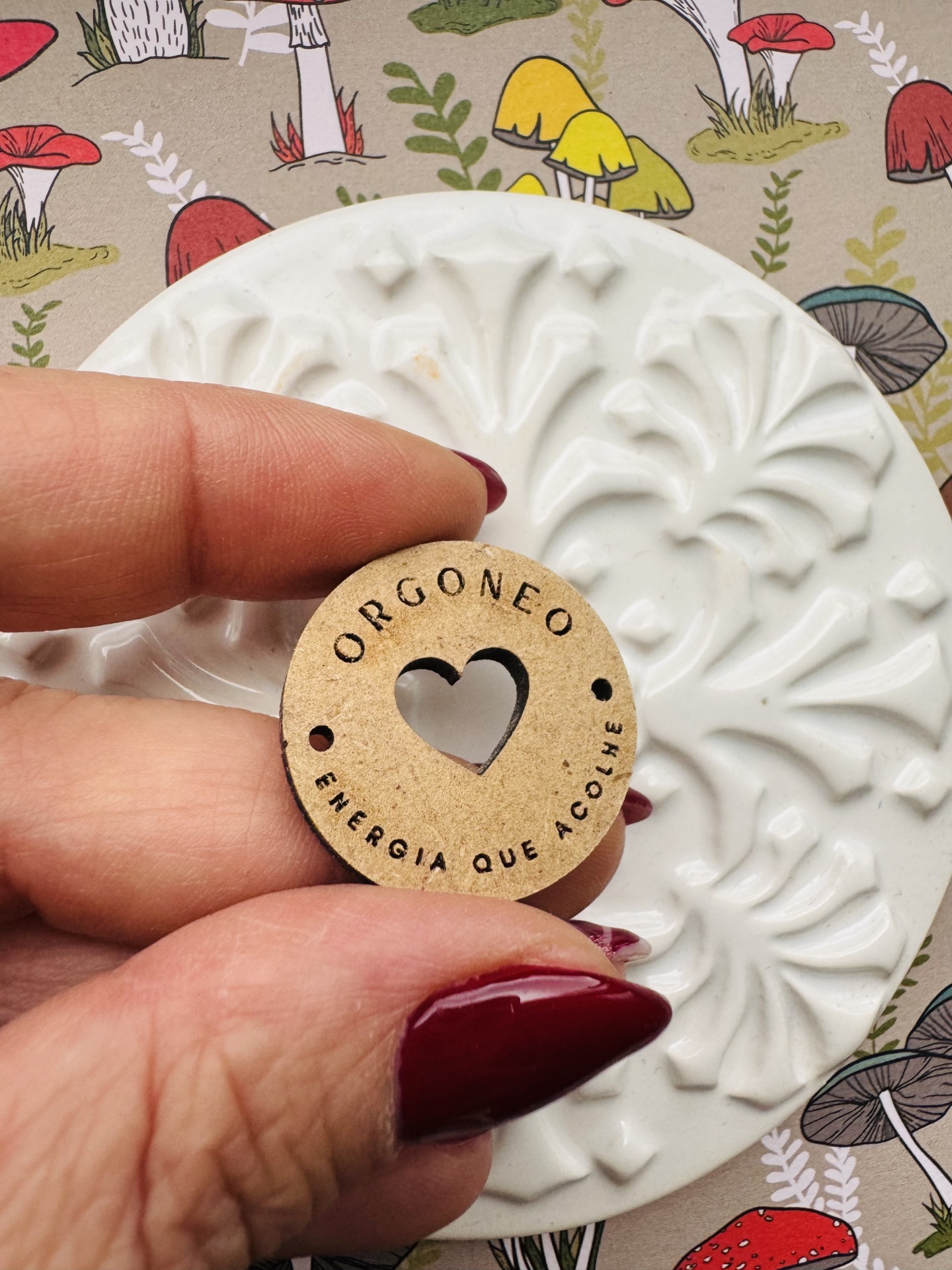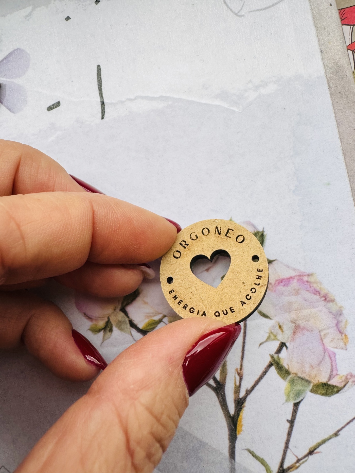 • Design Exclusivo: Botão redondo em madeira com um recorte central em forma de coração.