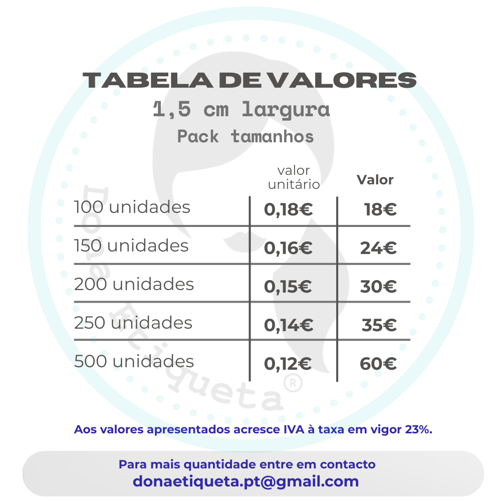 Nota!!! Não temos em stock de fita preta para impressão a 1,5cm de largura. As etiquetas serão brancas com impressão a preto.