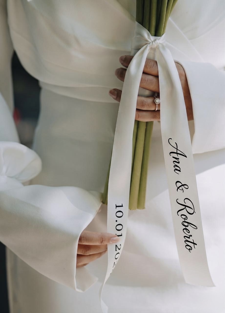 Eleve o simbolismo do seu ramo de noiva com um detalhe que conta a vossa história. Esta fita personalizada é desenhada para envolver as hastes do bouquet, transformando um arranjo floral numa recordação eterna e exclusiva.